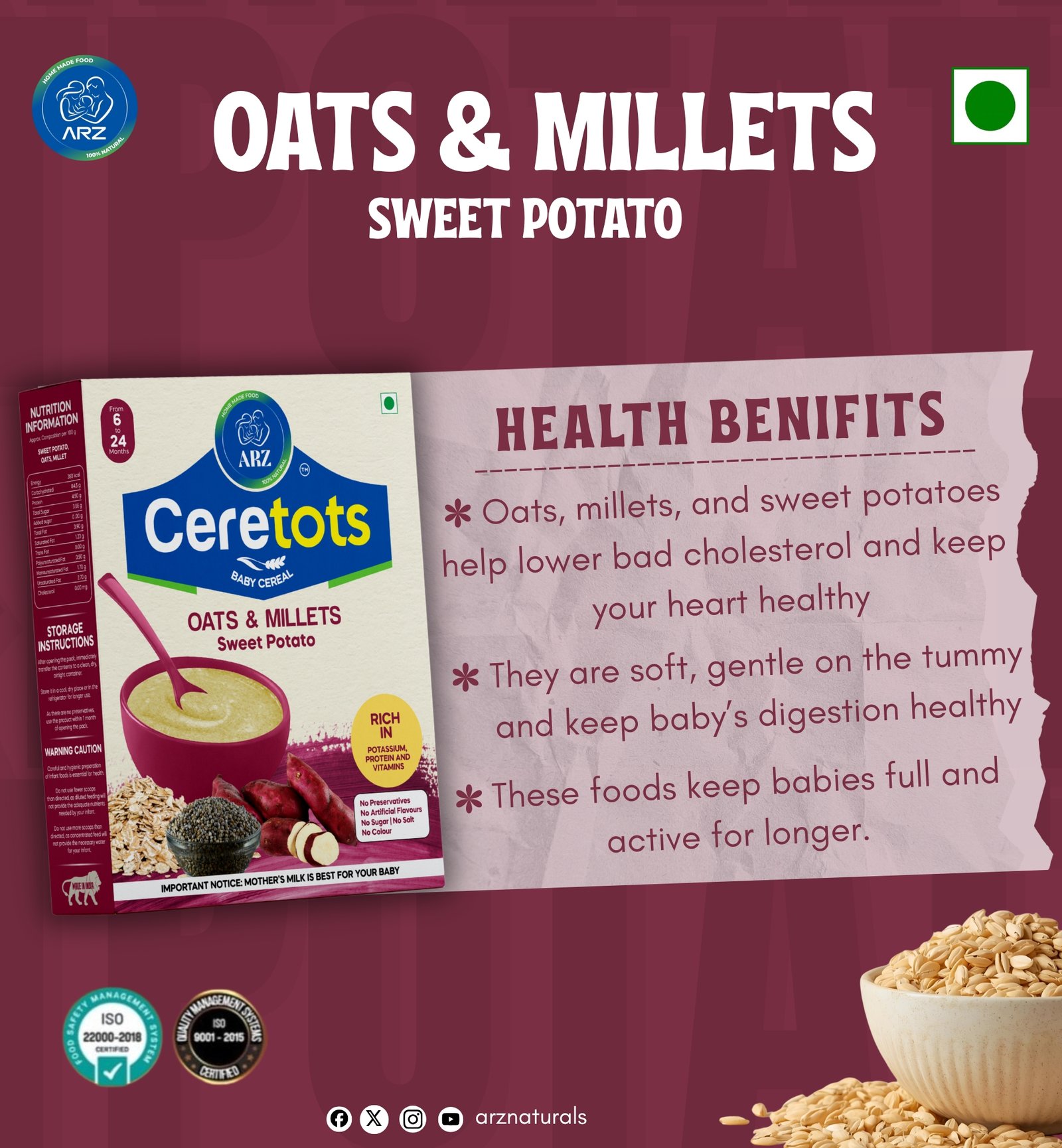 ARZ CERETOTS, OATS & MILLETS,SWEET POTATO, BABY Cereal (300 g, 6+ Months)