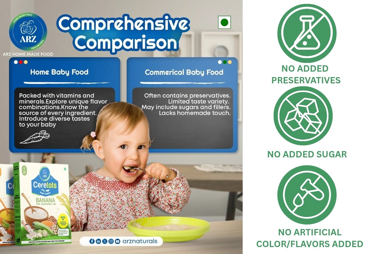 ARZ CERETOTS Banana Rice Masoordal Mix is a naturally nutritious and delicious baby cereal crafted for infants aged 6 months and above. This wholesome mix combines the goodness of banana, rice, and masoor dal to provide balanced nutrition with essential carbohydrates, proteins, and vitamins. It is gentle on the baby’s tummy, supports healthy weight gain, and promotes better digestion. Made in a homemade style with 100% natural ingredients, it contains no preservatives, added sugar, or artificial flavors.