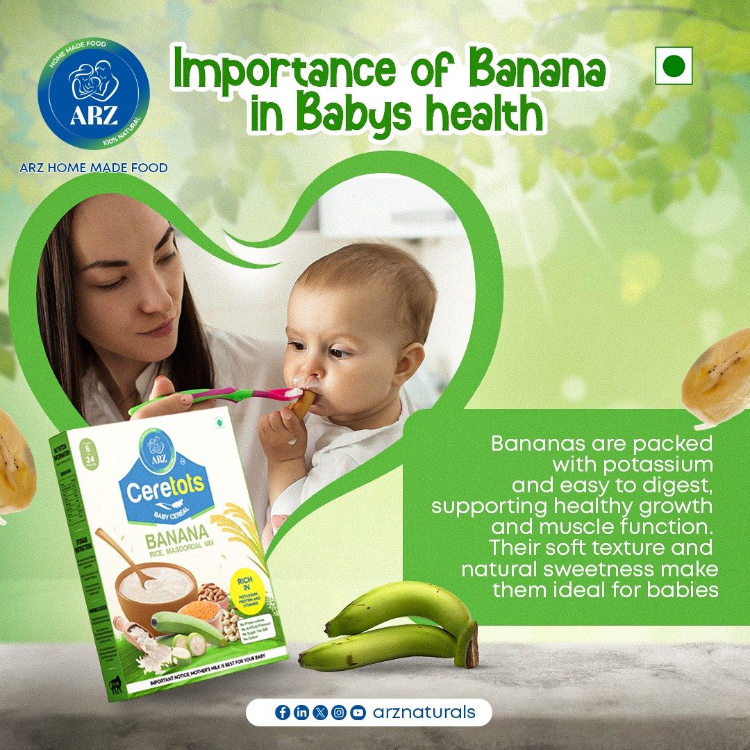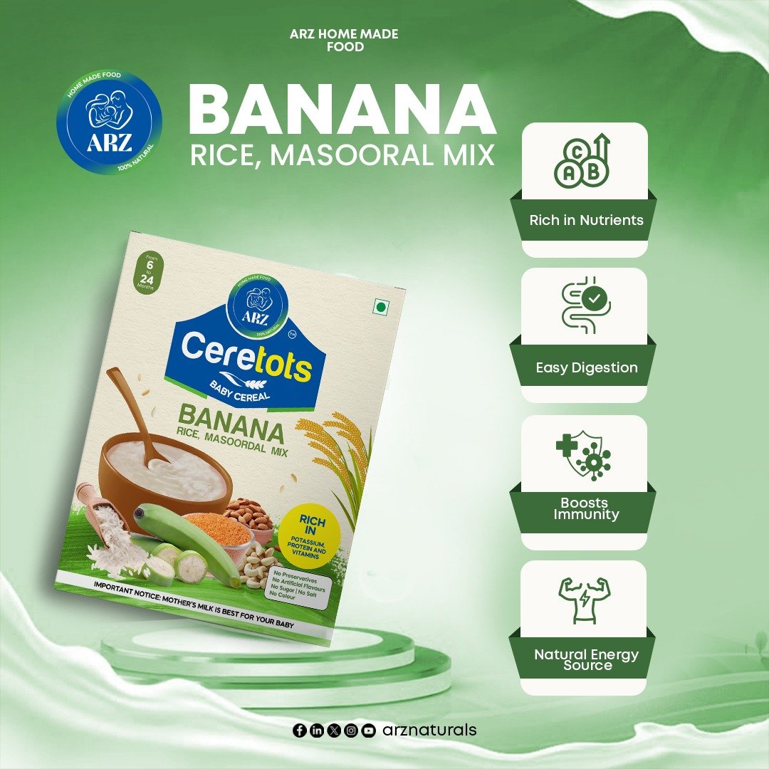 ARZ CERETOTS Banana Rice Masoordal Mix is a naturally nutritious and delicious baby cereal crafted for infants aged 6 months and above. This wholesome mix combines the goodness of banana, rice, and masoor dal to provide balanced nutrition with essential c Read More